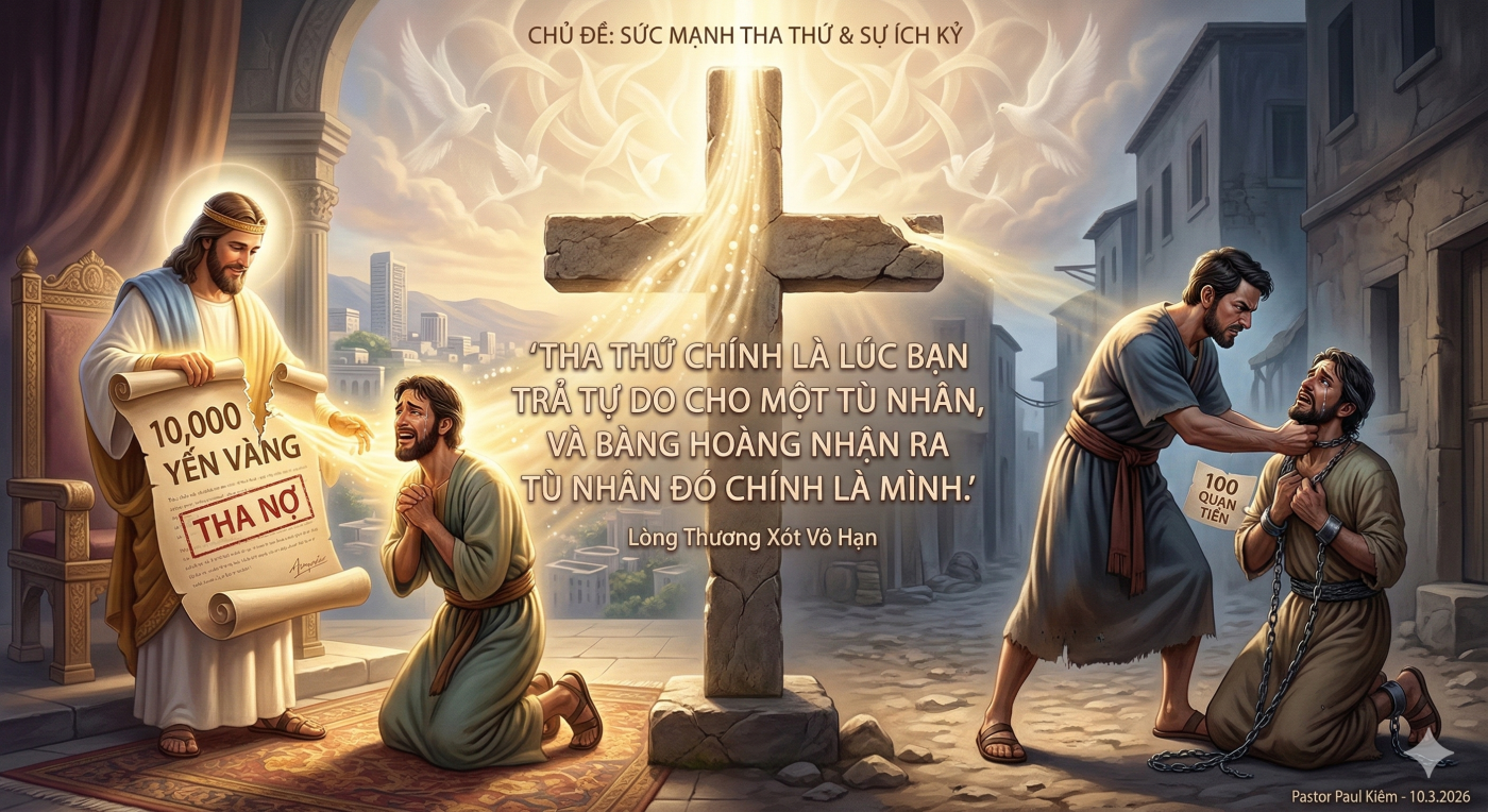 Đây chính là hình ảnh trần trụi về thói xấu của Cơ Đốc nhân chúng ta. Chúng ta đến đền thờ, ăn năn, nài xin và hoan lạc nhận lấy sự tha thứ vĩ đại của Chúa cho biết bao ích kỷ, kiêu ngạo, dối trá trong cuộc đời (món nợ 10.000 ta-lâng). Thế nhưng, khi bước ra khỏi nhà thờ, về đến gia đình hay trong Hội Thánh, chúng ta lại hóa thành những “ông chủ” khắc nghiệt. Chúng ta ghi sổ từng lỗi lầm nhỏ của vợ chồng, con cái, anh em cùng đức tin (món nợ 100 đơ-ni-ê). Chúng ta đòi hỏi người khác phải hoàn hảo với mình, trong khi chính mình lại đầy rẫy bất toàn trước mặt Chúa.