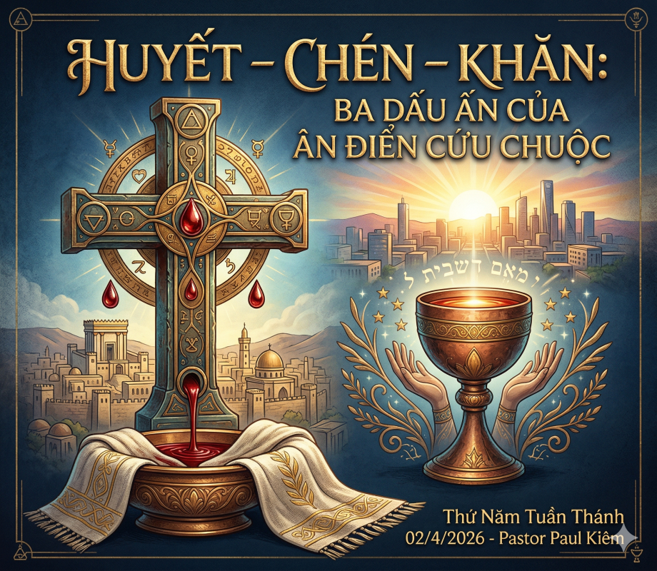 Hàng ngàn năm sau, Lễ Tiệc Ly mở ra không phải như một nghi thức điểm xuyết cho lộng lẫy, mà là thời khắc Đức Chúa Trời chuẩn bị thực hiện một cuộc “Sáng Thế Mới”. Nếu 7 từ ban đầu tạo ra sự sống vật lý, thì Đêm Thánh này là bước đệm đưa đến Thập Tự Giá và sự Phục Sinh — nơi linh hồn đổ nát của con người được tái tạo trọn vẹn. Sự mầu nhiệm ấy trải dài từ huyết Chiên Vượt Qua bôi trên khung cửa (quá khứ), hóa thành chén Giao Ước Mới ngự giữa lòng Hội Thánh (hiện tại), và thu mình lại trong chiếc khăn quấn ngang lưng Đấng Christ (tương lai hướng về). Ba dấu ấn: Huyết, Chén, và Khăn, đồng thanh cất tiếng dạy một dân tộc được chọn cách sống: được tha thứ, được thánh tẩy, và được sai đi.